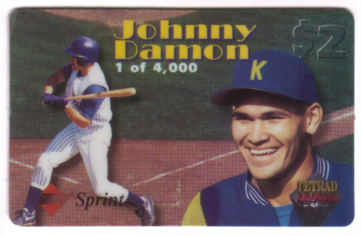 The card is valued at $2, indicated in the upper right corner. The text "Johnny Damon" appears in large yellow lettering at the top center, with "1 of 4,000" beneath it, suggesting this card is part of a limited edition release. The Sprint logo is positioned near the lower left, signifying the card's association with the Sprint telecommunications company.