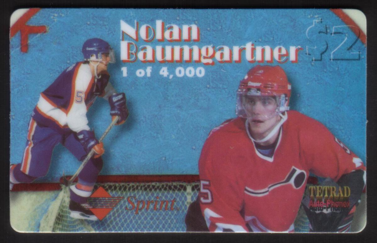 The card includes the "Auto-Phonex Tetrad Hockey" branding, indicating it is part of a hockey-themed series. The Sprint logo is present, showing the company that supported or sponsored the card. The design focuses on an ice hockey sports theme, specifically highlighting Nolan Baumgartner’s involvement in the sport. The text on the card confirms the player’s name and number, providing authentic identification.