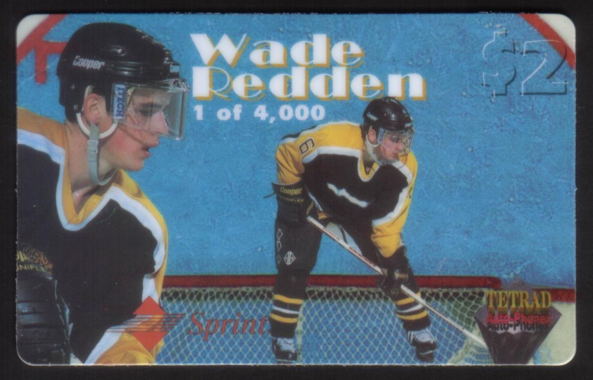 The overall layout combines sports, telecommunication, and collectible card design elements. The branding for Sprint is visible, tying the card to the telecommunications company. The Auto-Phonex Tetrad branding indicates the manufacturer or series related to collectible phone cards. This card is specifically dedicated to Wade Redden in an ice hockey sports context, with all text and visuals aligned to his image and the sport he represents.