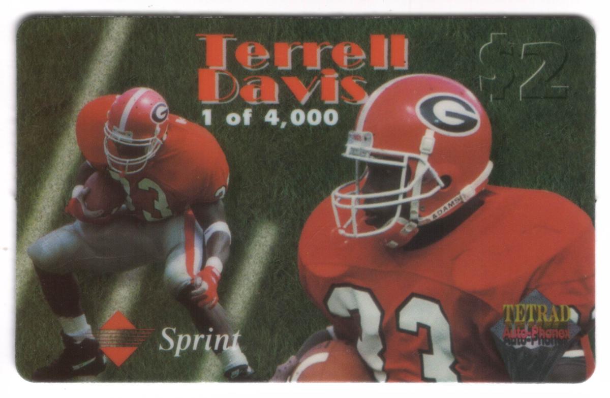 This collectible chip card features Terrell Davis, the former professional American football player, prominently displayed in his football uniform. The card is part of the Auto-Phonex Tetrad Football series and is valued at $2. Terrell Davis is designated with the number 59, which appears on the card. The design captures a dynamic pose of Davis, emphasizing his athletic stature and connection to football.