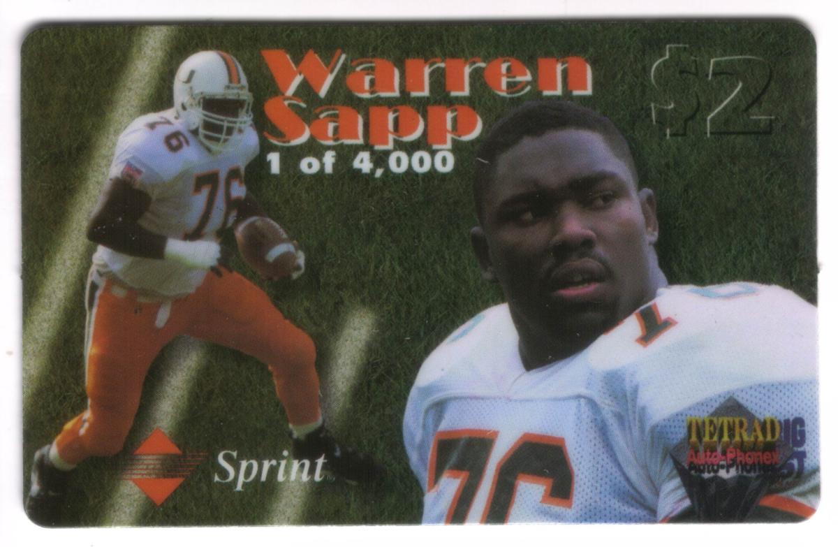 The text on the card clearly identifies Warren Sapp by name and jersey number. The card’s graphics emphasize the football theme with sharp colors and a professional sports layout. The Sprint logo is present, highlighting the card’s connection to the telecommunications company. The overall style reflects a collectible sports card aimed at fans of football and of the player Warren Sapp.