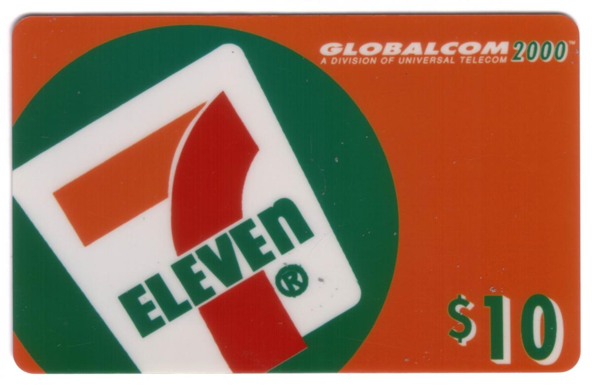 This card is an issued phone card from the 7-Eleven brand, associated with Globalcom 2000, intended for telecommunication use with a prepaid value of ten dollars.