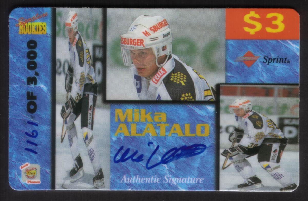 This item is connected to the sport of ice hockey and is part of an autograph rookie signature series, underscoring its value as a collectible among fans and collectors focused on hockey memorabilia. The card’s presentation centers on Mika Alatalo’s image and autograph, with clear identification of the player and series involved.