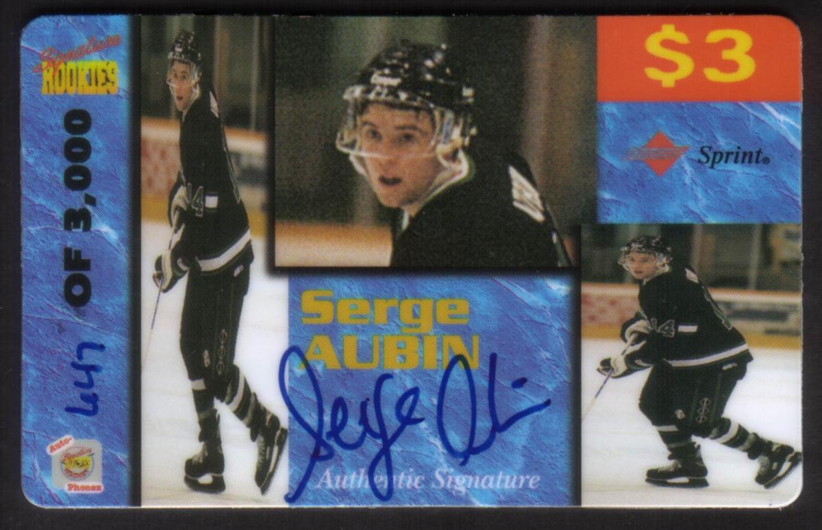 This collectible item is an Auto-Phonex Signature Rookie card featuring Serge Aubin, a professional ice hockey player. The card is labeled as Hockey Card #4 from the Sprint series. It prominently displays an authentic autograph by Serge Aubin, making it a valuable piece for collectors interested in ice hockey memorabilia. The card includes the branding of Sprint, linking it to the telecommunications company.