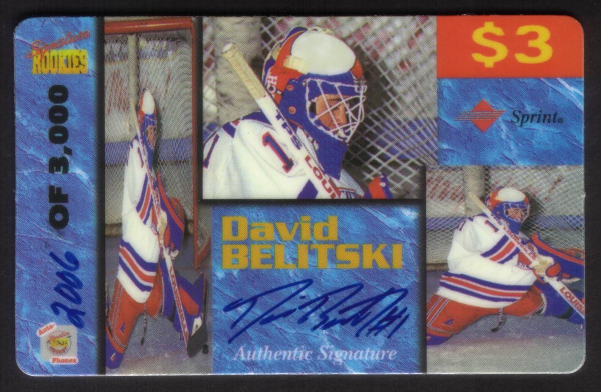 This collectible item is an ice hockey trading card featuring David Belitski, identified as a rookie player. The card includes an authentic autograph labeled "Auto-Phonex Signature Rookies," confirming its status as a signed collectible. The word "Sprint" is also present on the card, indicating an association with the Sprint brand.