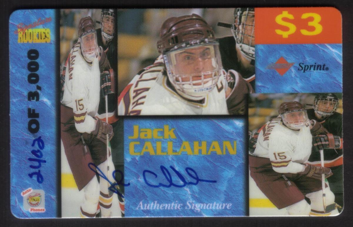 This collectible card features Jack Callahan, a hockey player, prominently displayed in full gear. He is dressed in a white hockey jersey with blue and orange striping on the sleeves and around the waist. Jack Callahan’s name appears clearly on the card along with the designation "Auto-Phonex Signature Rookies," indicating it includes his authentic signature. The card number is #11, and the brand associated with it is Sprint.