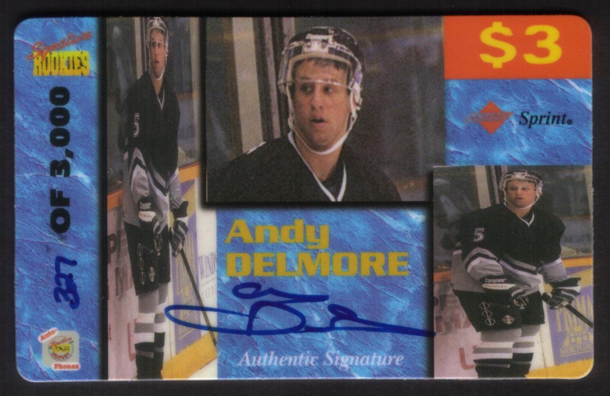 This collectible is officially licensed and geared toward hockey card collectors who value rookie autographs. It is a straightforward representation of Andy Delmore’s rookie card within the context of professional ice hockey memorabilia, combined with a verified signature that enhances its collectible appeal.