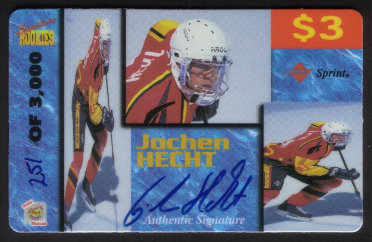 This collectible is a hockey sports card that emphasizes Jochen Hecht’s early professional career, featuring an authentic autograph valued at $3. The card’s layout integrates both sports imagery and official branding, establishing it as a genuine piece for hockey and autograph collectors alike.