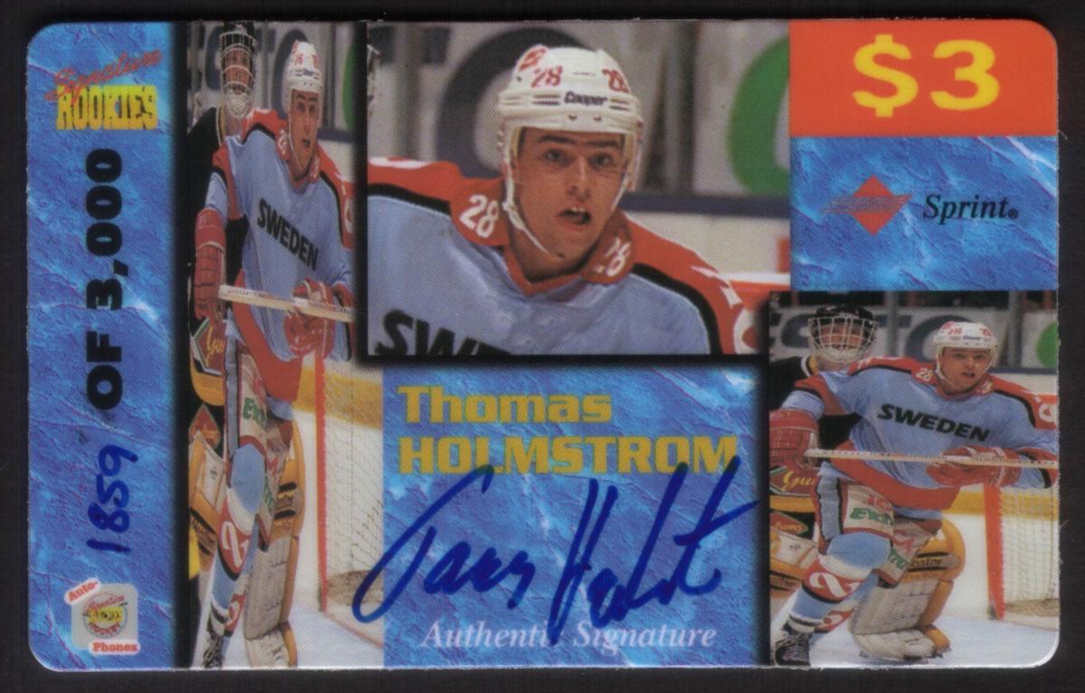 This card is specifically an Auto-Phonex Signature Rookies edition, featuring the autograph of Thomas Holmstrom. The focus is on rookie status and authenticity through the signature, which is marked with a $3 denomination visible on the front of the card. The card’s association with ice hockey and the athlete Thomas Holmstrom confirms its place within sports memorabilia collections.