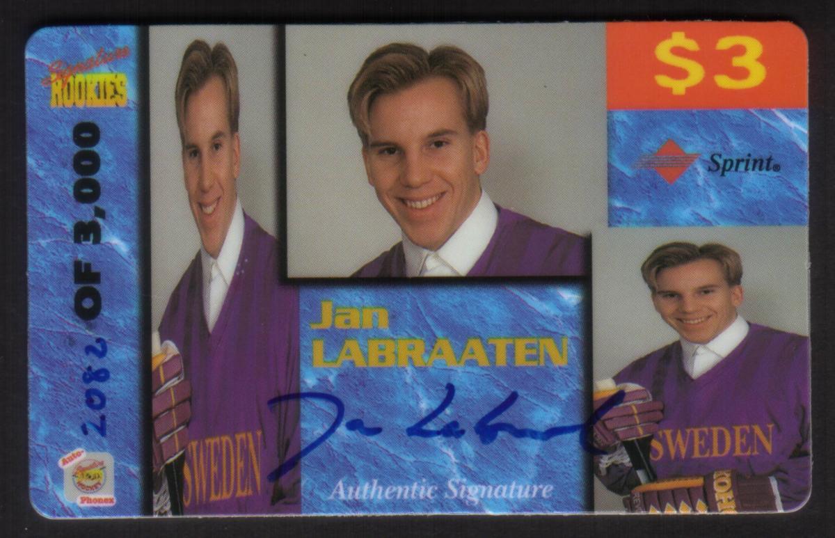 This collectible hockey card features Jan Labraaten, identified as a rookie player, prominently displayed in the image. The card is part of the Auto-Phonex Signature Rookies series and includes an authentic signature of Jan Labraaten, enhancing its value for collectors. The card number is 24, and the name Sprint appears prominently, indicating a sponsorship or partnership related to the card.