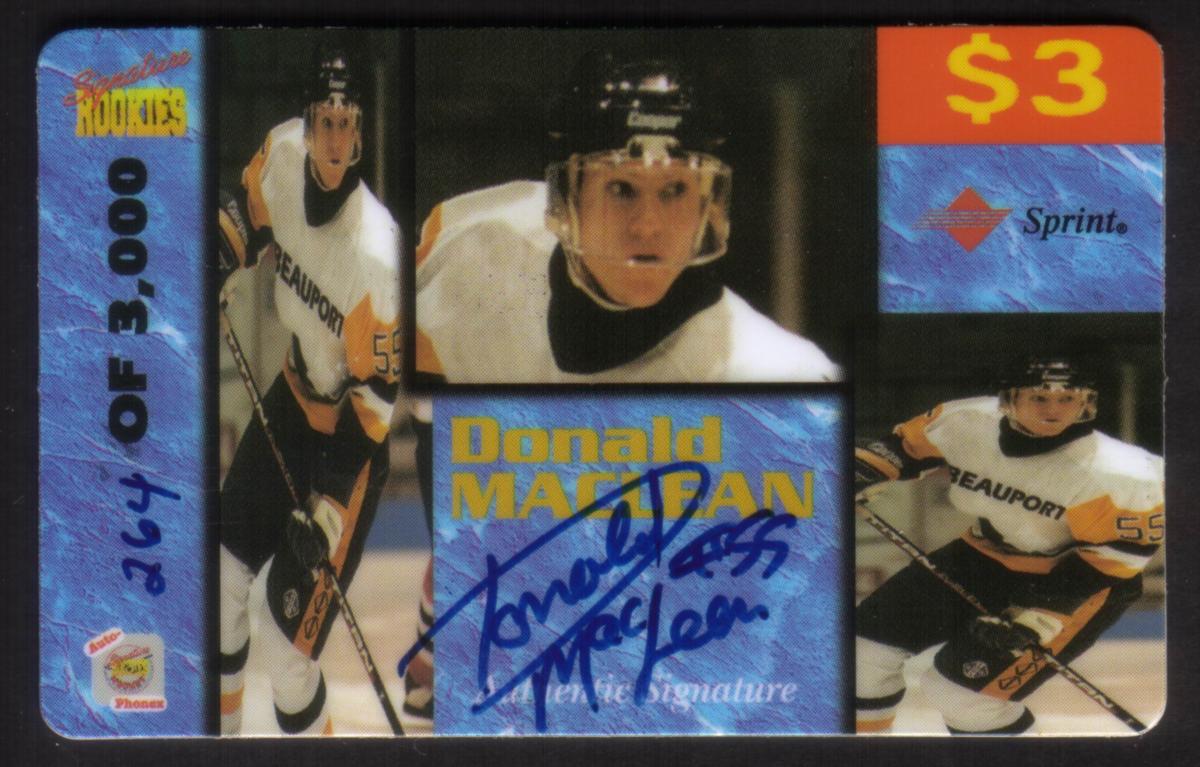 No additional player numbers are visible on the helmet or in the image. The card is dedicated to the sport of ice hockey and highlights Donald MacLean as a notable rookie player. The overall presentation focuses on the athlete and his autograph, making it a valuable item for collectors of sports memorabilia.