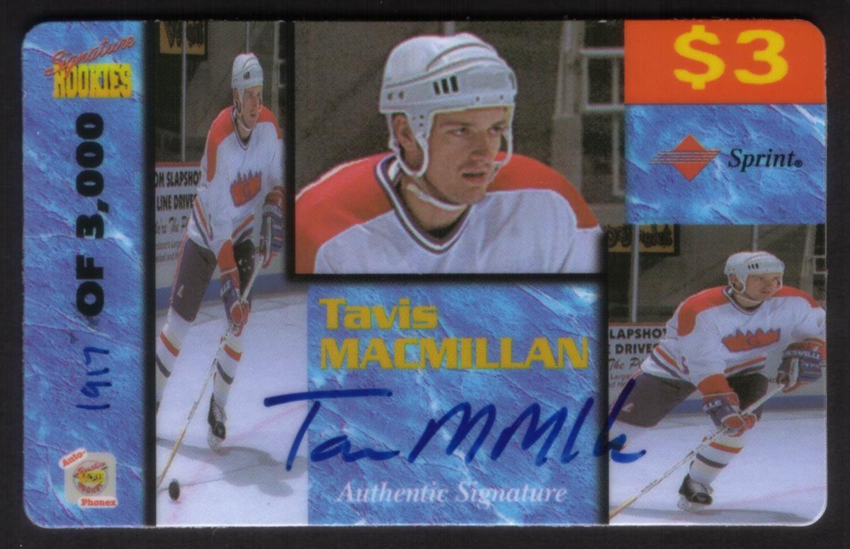 This collectible card features professional ice hockey player Tavis MacMillan. It is labeled as "Auto-Phonex Signature Rookies" and includes an authentic signature of Tavis MacMillan. The card is numbered #27 and produced in collaboration with Sprint.