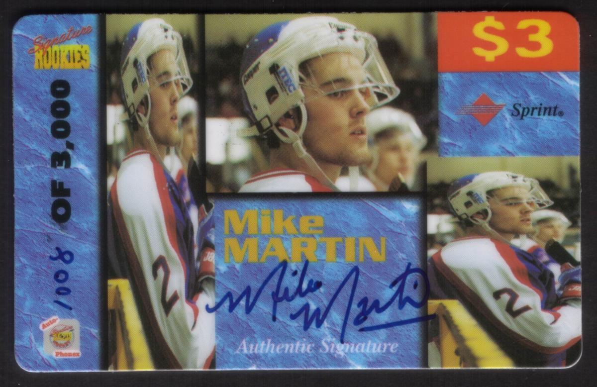 This card is designed as a collectible item centered around Mike Martin's rookie season, featuring his authentic signature, making it valuable for hockey card collectors and fans of the sport.