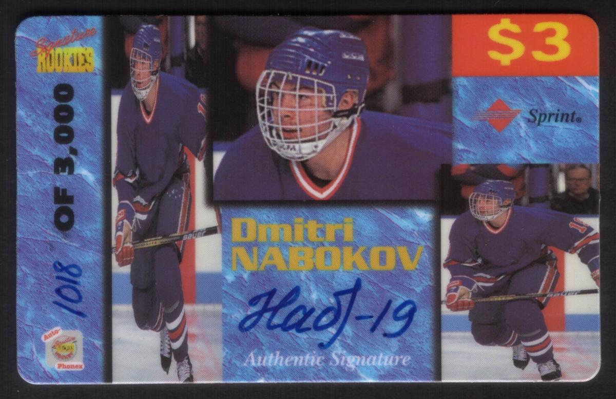 This collectible hockey card features Dmitri Nabokov, an ice hockey player, prominently displayed in the center. He is wearing a white and blue hockey uniform and helmet while actively participating in a game. The card is part of the Auto-Phonex Signature Rookies series and includes an authentic signature, indicated by "$3. Auto-Phonex" text on the card. The autograph is visible in blue ink across the lower portion of the card.