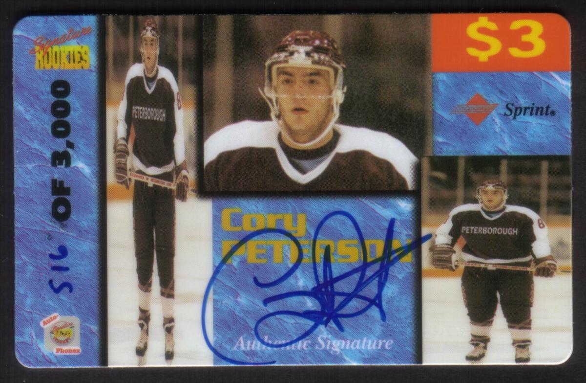 This card is a collectible sports memorabilia that combines a rookie player image with an authentic signature, making it valuable for fans of Cory Peterson and hockey card collectors. The inclusion of the Sprint logo connects it with the Sprint brand, confirming its official partnership or endorsement.