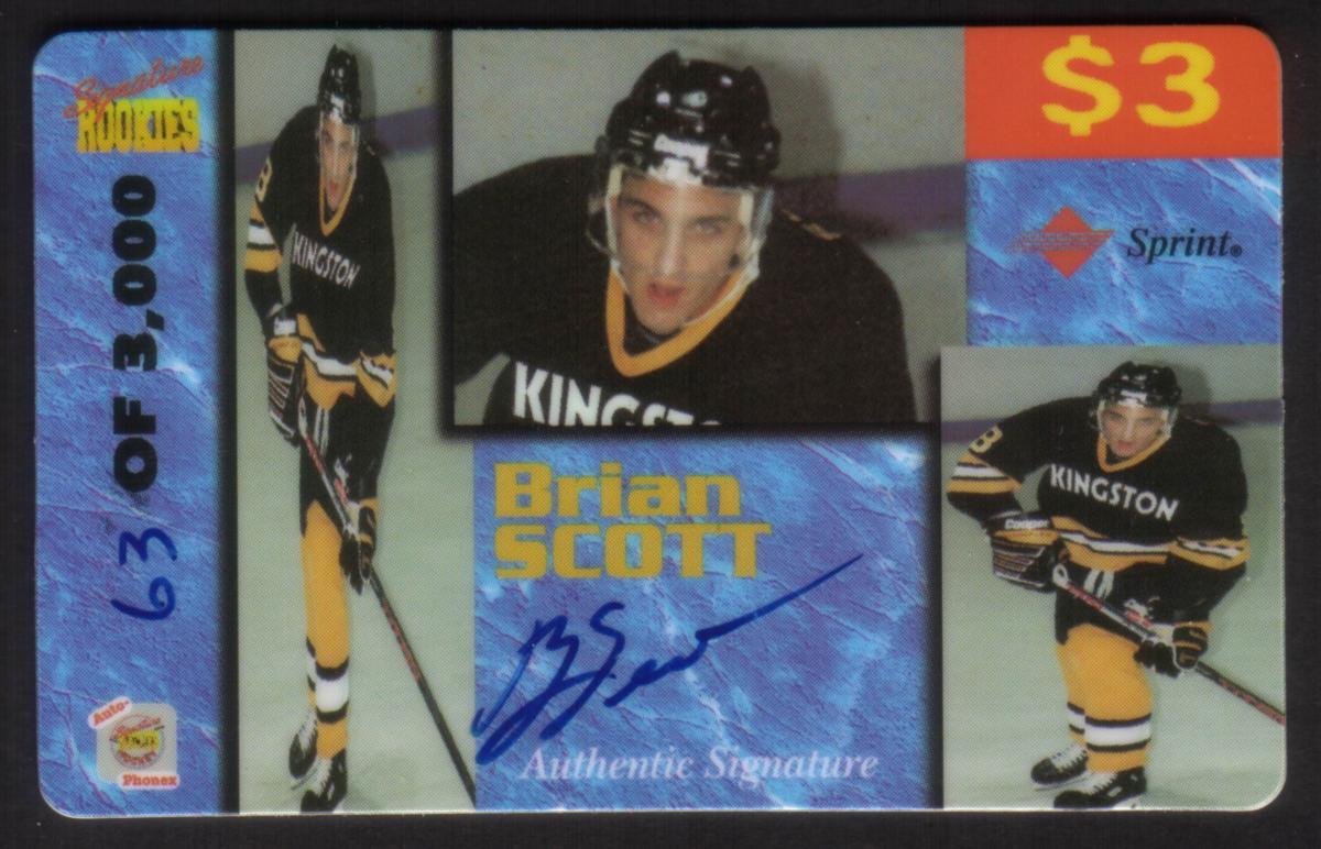 Brian Scott’s autograph is clearly visible on the card in silver ink, placed horizontally across the lower portion of the card’s front. The design incorporates a blue and silver color scheme with subtle geometric patterns behind the player’s image, enhancing the collectible’s aesthetic. The card highlights the sport of ice hockey and is specifically associated with hockey players and authentic signatures.