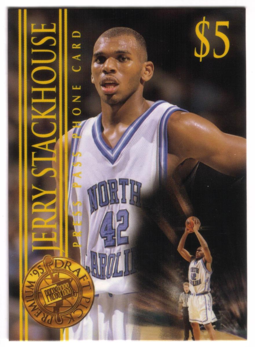 The card highlights Jerry Stackhouse’s connection to the North Carolina Tar Heels and commemorates his status as a premium draft pick from the year 1995. Its design integrates sports memorabilia themes with collectible phone card elements, making it a distinct piece for fans of basketball and card collectors alike.