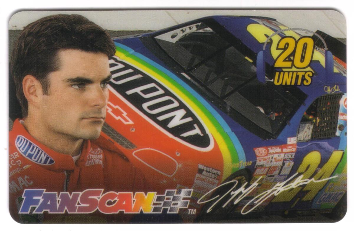 At the top right corner of the card, "20 UNITS" is printed in bold yellow text. The bottom left corner of the card has the "FanScan" logo in colorful letters with a checkered flag pattern incorporated. Jeff Gordon’s autograph signature in white script appears towards the bottom right, over the number "24" that is painted on the side of his car.