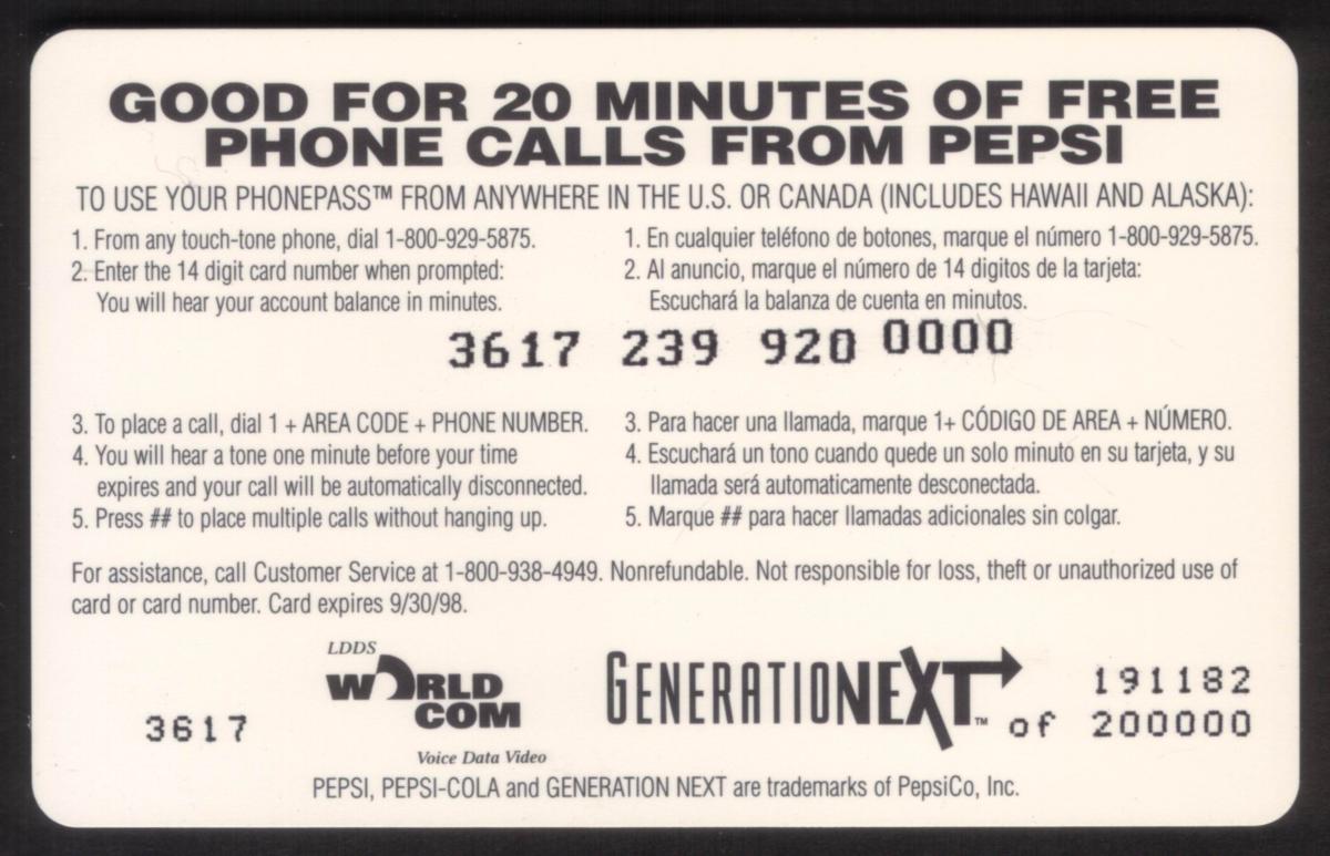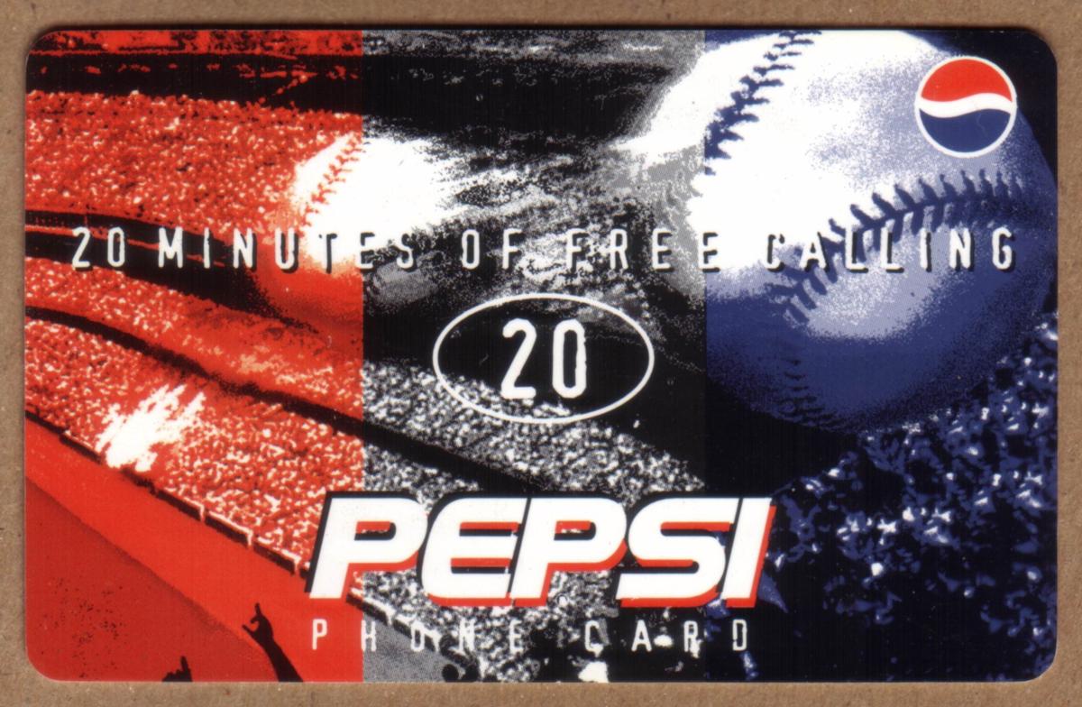 This limited edition promotional phone card was issued by Pepsi-Cola and offers 20 minutes of free calling time. It is part of the GenerationNext 20M Pepsi Generation Next Baseball series. The card’s design emphasizes the connection between Pepsi beverages and baseball, serving as a collectible item for fans of both the brand and the sport. The text "USED - LDDS WorldCom" is associated with the card, indicating it was distributed or utilized through WorldCom.