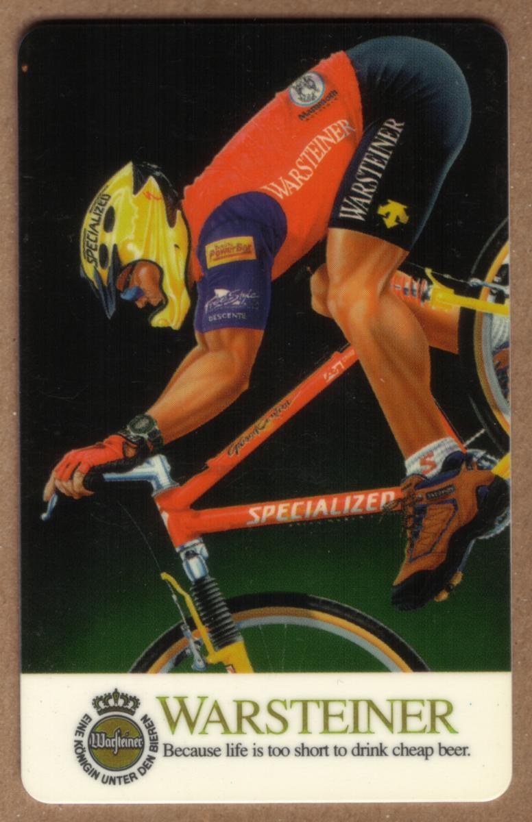 Keywords associated with the card include cycling, specialized helmet, specialized bicycle, transportation, artistic style, Warsteiner Beer, and the phrase "eine konigin unter den bieren." The card highlights the theme of professional road cycling alongside the Warsteiner beer branding.