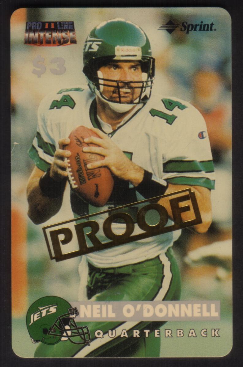 This collectible phone card features Neil O'Donnell, quarterback for the New York Jets, captured in action holding a football. He wears a white football uniform with green stripes on the sleeves and pants, and the number 14 is visible on his jersey. The New York Jets helmet logo appears in the lower left corner, emphasizing the team association.