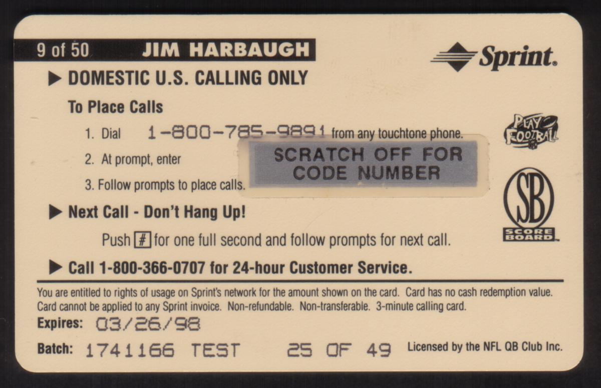 This phone card was released in 1997 by The Score Board Inc., aligning with professional football memorabilia. It highlights Jim Harbaugh as a key player for the Colts during that time.