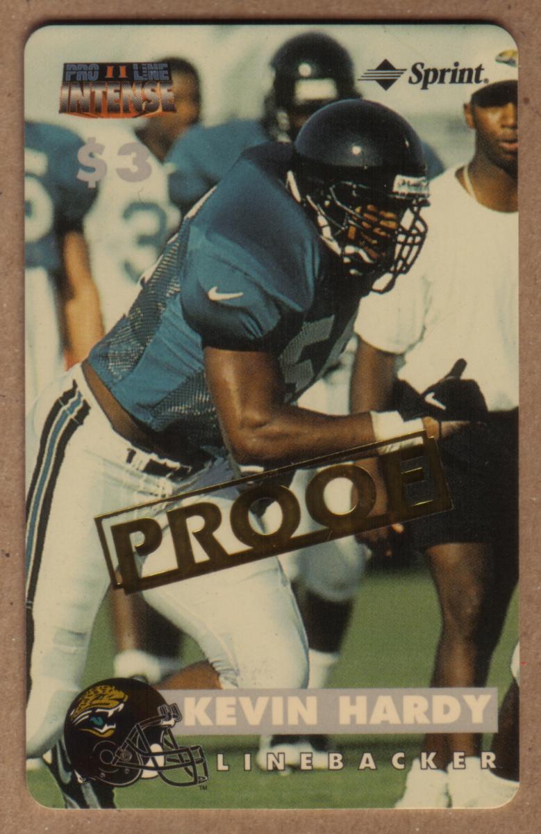 The background includes elements of a football field with green turf and yard markings visible. The card layout emphasizes the sporty, intense action theme, highlighting Kevin Hardy as a professional football linebacker during the 1997 NFL season.