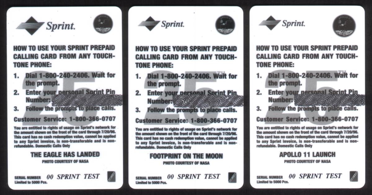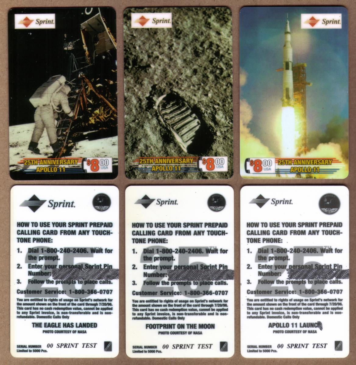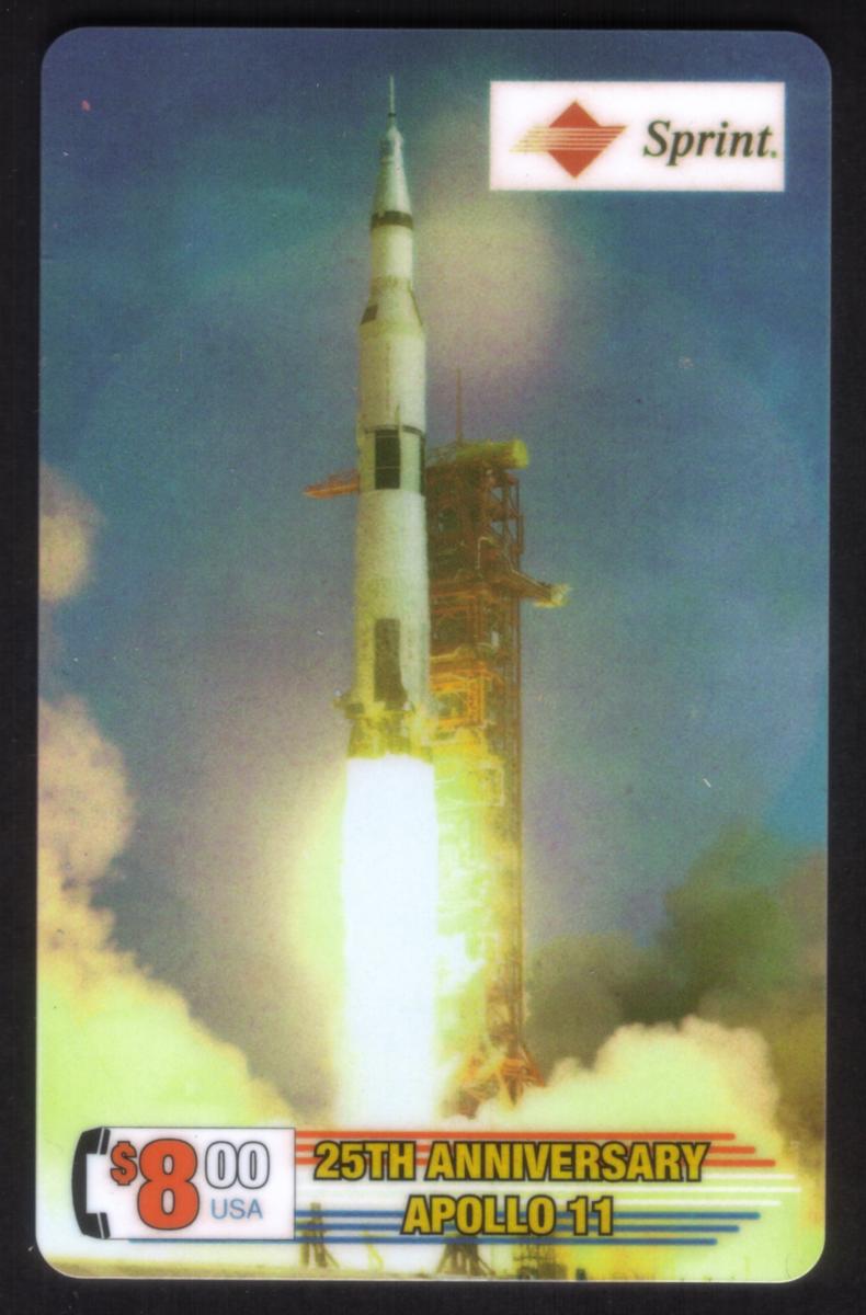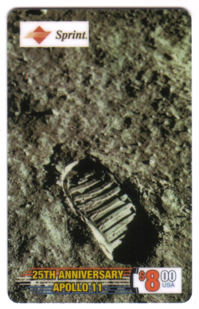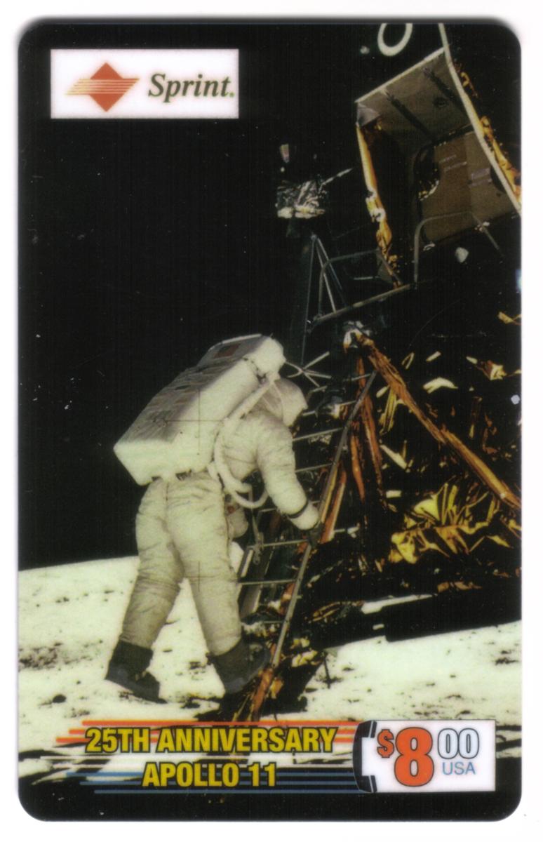 This collectible phone card features imagery related to NASA’s Apollo 11 mission, commemorating the 25th anniversary of this historic event. The card set includes three distinct designs focusing on key aspects of the lunar landing. One card depicts the Apollo 11 rocket launch, showing the spacecraft as it ascends amid billowing smoke and flames. Another card presents the detailed ladder on the lunar module, the structure astronauts used to climb down to the Moon’s surface. The third card shows astronaut footprints on the Moon, symbolizing humanity’s first steps on another celestial body.