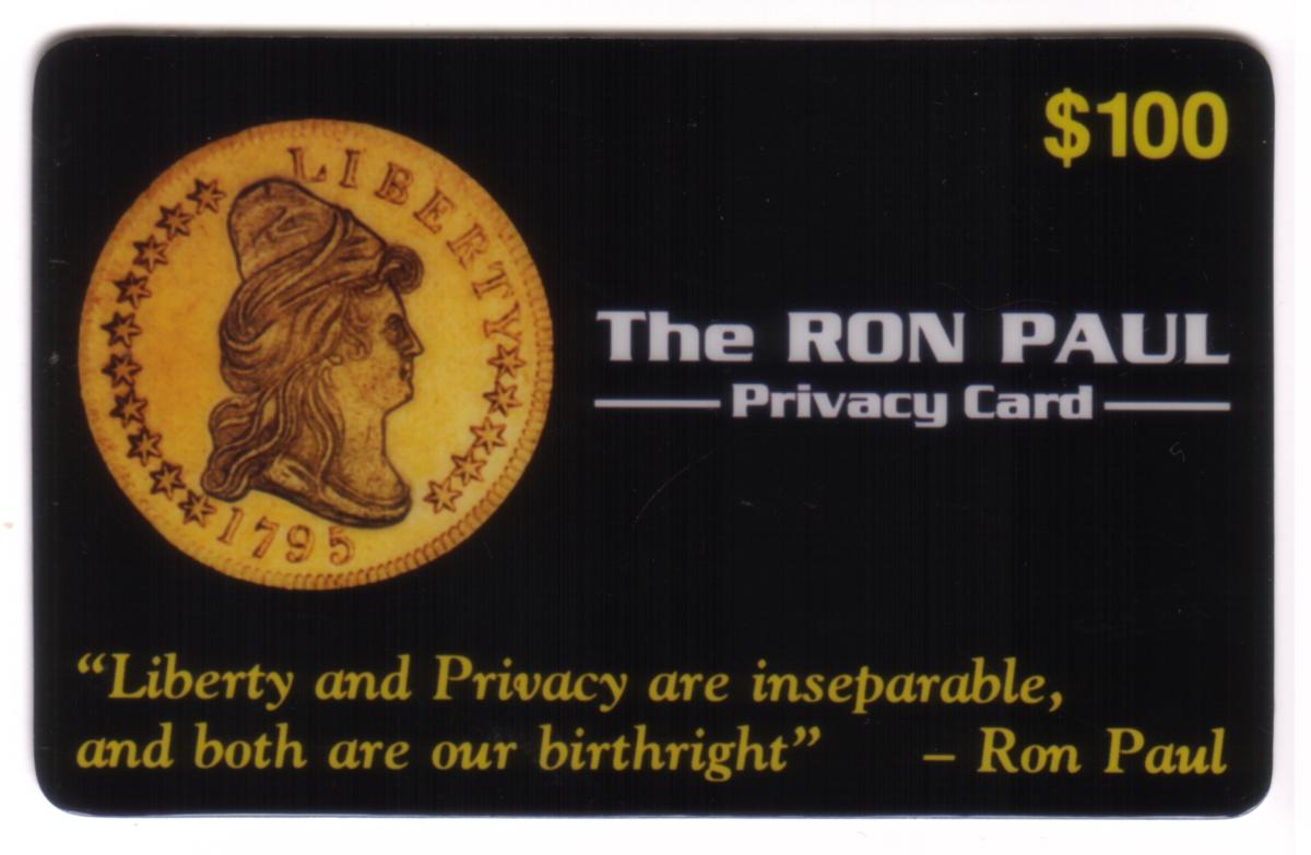 This specimen $100 Ron Paul Privacy Card celebrates themes of liberty, privacy, politics, and conservatism. It aligns with libertarian ideals and is connected to Ron Paul, a noted politician known for advocating privacy and liberty. The card is associated with USACard Corporation and reflects interests in money, currency, and numismatics.