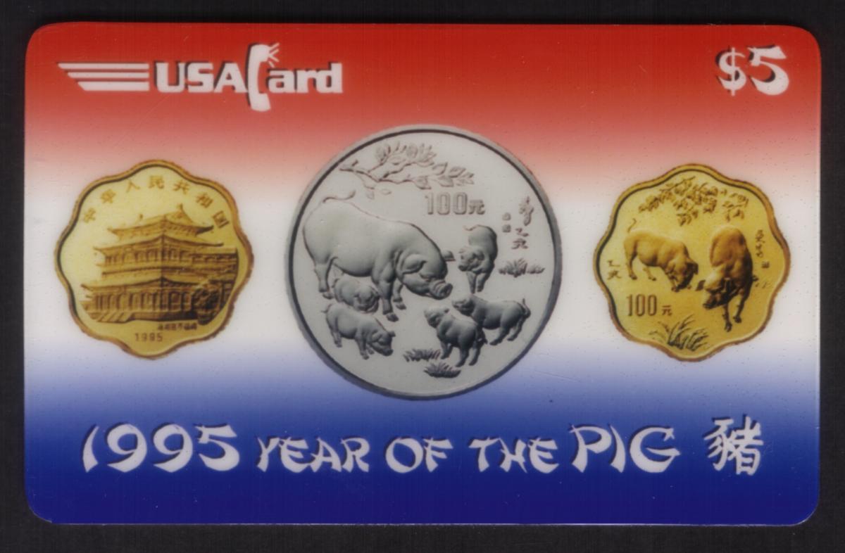 The card includes the USACard logo in the top left corner, with a winged design element incorporated into the text. The value "$5" is printed in white on the top right corner. Along the bottom edge, the phrase "1995 YEAR OF THE PIG" is written in a stylized white font, accompanied by the Chinese character for pig (猪). The overall design emphasizes the Chinese holidays theme, specifically celebrating the Year of the Pig in numismatic form through gold and silver commemorative coins.
