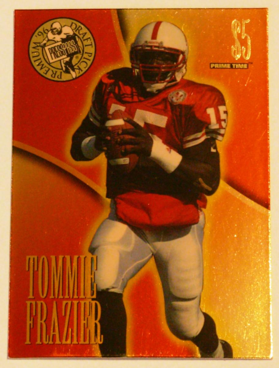 In the upper left corner, a circular emblem reads "1996 Draft Pick Premium" surrounding an image of a football player. The upper right corner displays a "$5" denomination along with the words "Prime Time" underneath. Tommy Frazier’s name appears in bold gold letters along the lower left side of the card.