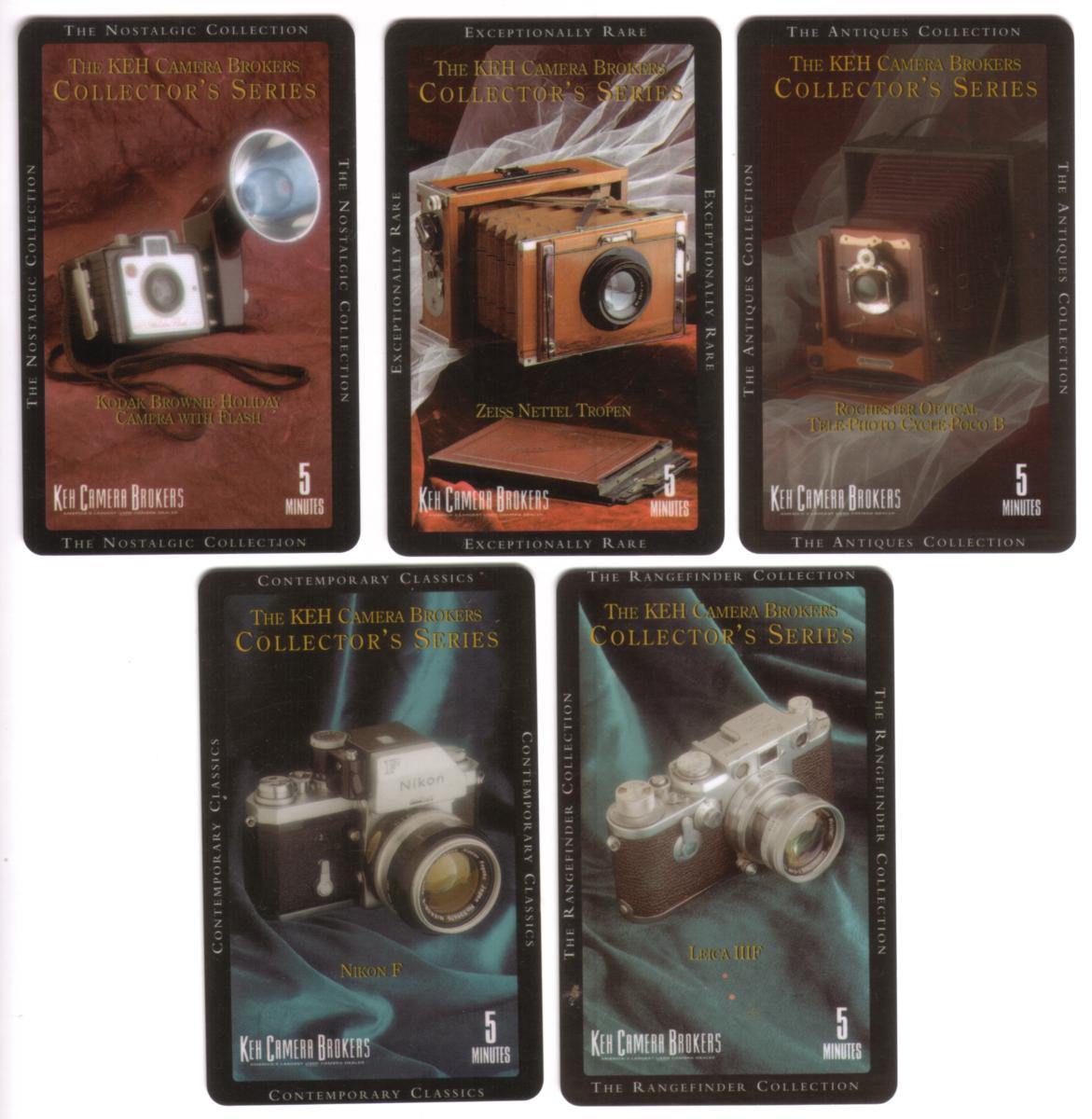 This set of five collectible phone cards is from the KEH Camera Brokers Collector's Series, each card displaying a different vintage or classic camera model with a five-minute usage designation in the bottom right corner. The cards emphasize nostalgia and the historical significance of camera technology.