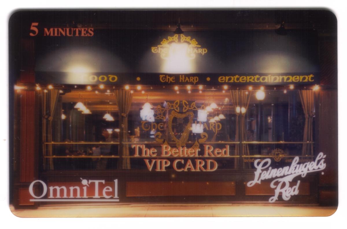 This collectible phone card features the illuminated front exterior of The Harp Bar & Lounge at night. Displayed prominently in the center of the card is the text "The Better Red VIP CARD," accompanied by a harp graphic that references the bar’s name. Above this, golden lettering includes the words "Food," "The Harp," and "Entertainment," highlighting the venue’s offerings. The establishment’s entrance is warmly lit with multiple hanging lights visible through large windows, giving a welcoming and vibrant nighttime ambiance.