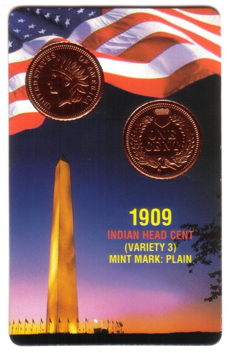 The first card displays a 1909 Indian Head Cent (Variety 3) with a plain mint mark. The coin images are positioned over a striking backdrop featuring the Washington Monument at sunset with multiple small flags around its base and a waving American flag above. The coin front shows the profile of a Native American with the legend “UNITED STATES OF AMERICA,” while the reverse features the denomination “ONE CENT” framed by a wreath.