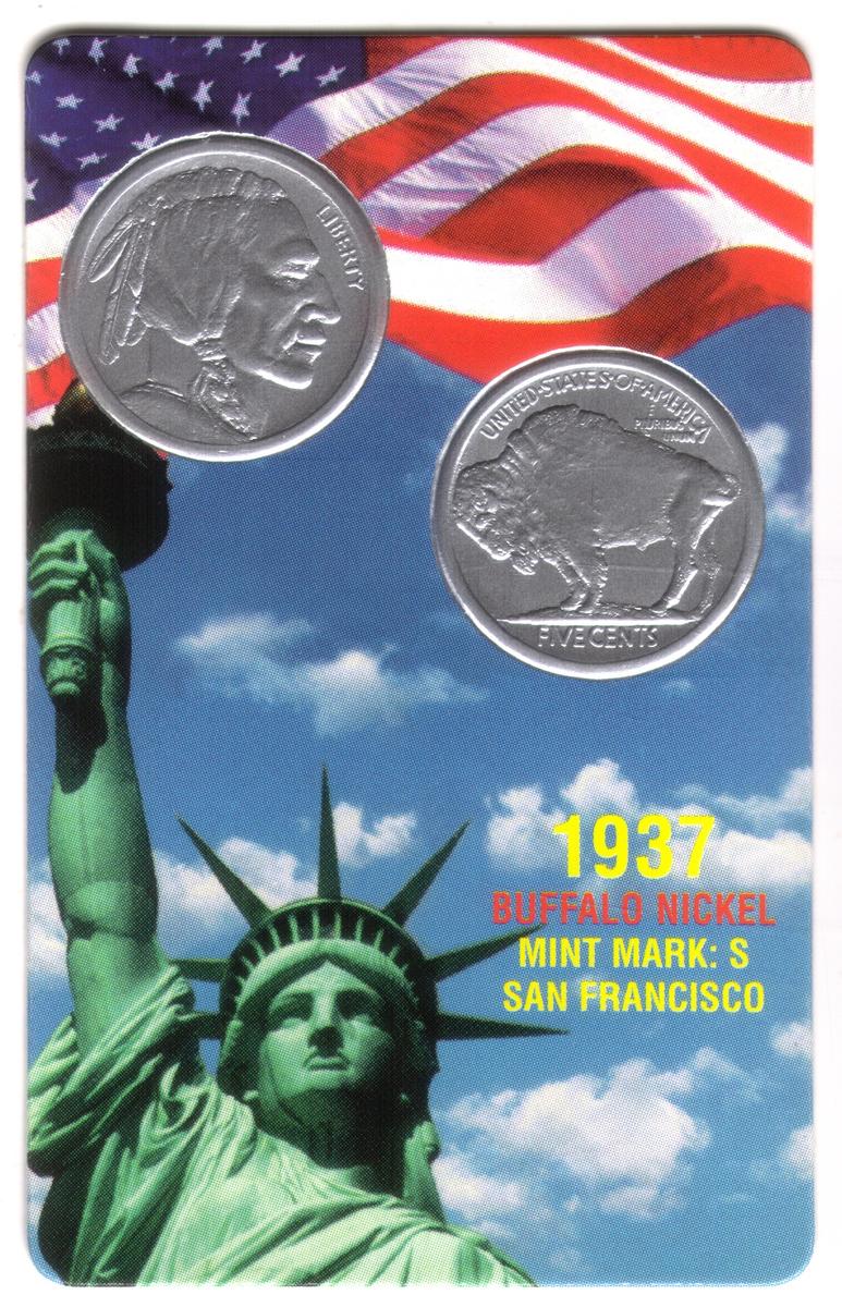 The second card highlights a 1937 Buffalo Nickel with an “S” mint mark from San Francisco. The coin’s obverse depicts the Native American profile, and the reverse shows a buffalo, representing the buffalo nickel design. These images are set above a bright image of the Statue of Liberty holding her torch against a partly cloudy blue sky, with an American flag waving near the top of the card.