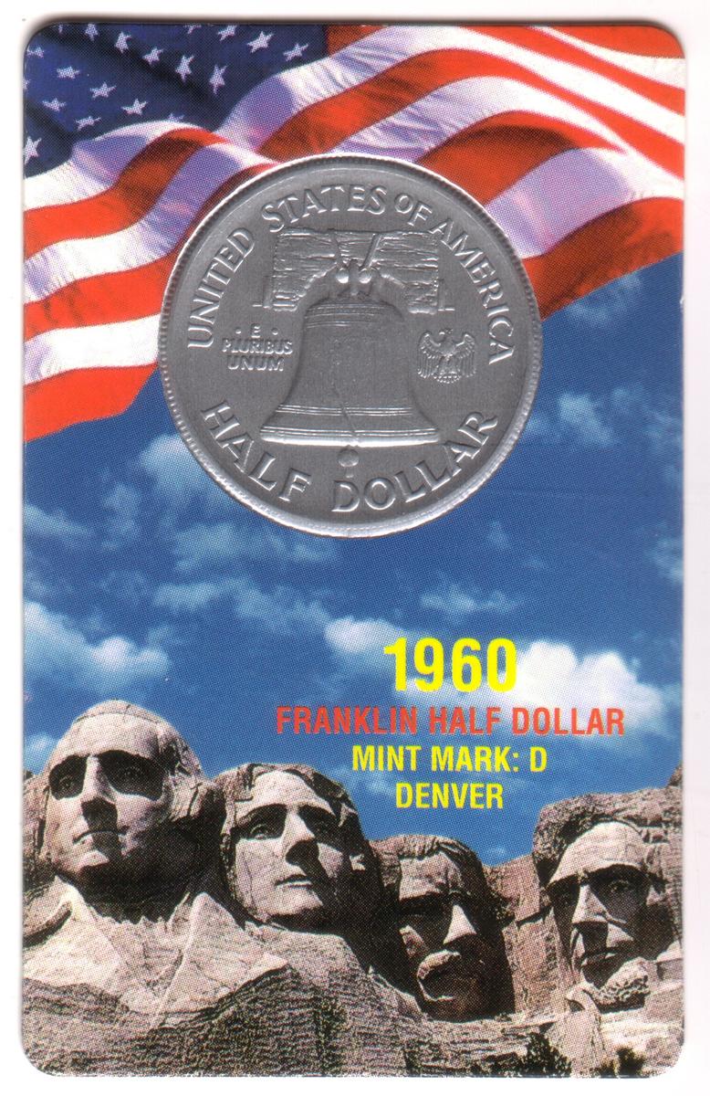 The third card presents a 1960 Franklin Half Dollar with a “D” Denver mint mark. The coin’s obverse shows the Liberty Bell and a small eagle to the side, with the inscriptions “UNITED STATES OF AMERICA” and “HALF DOLLAR.” The background features Mount Rushmore with the faces of four U.S. presidents carved into the granite and a bright American flag above.
