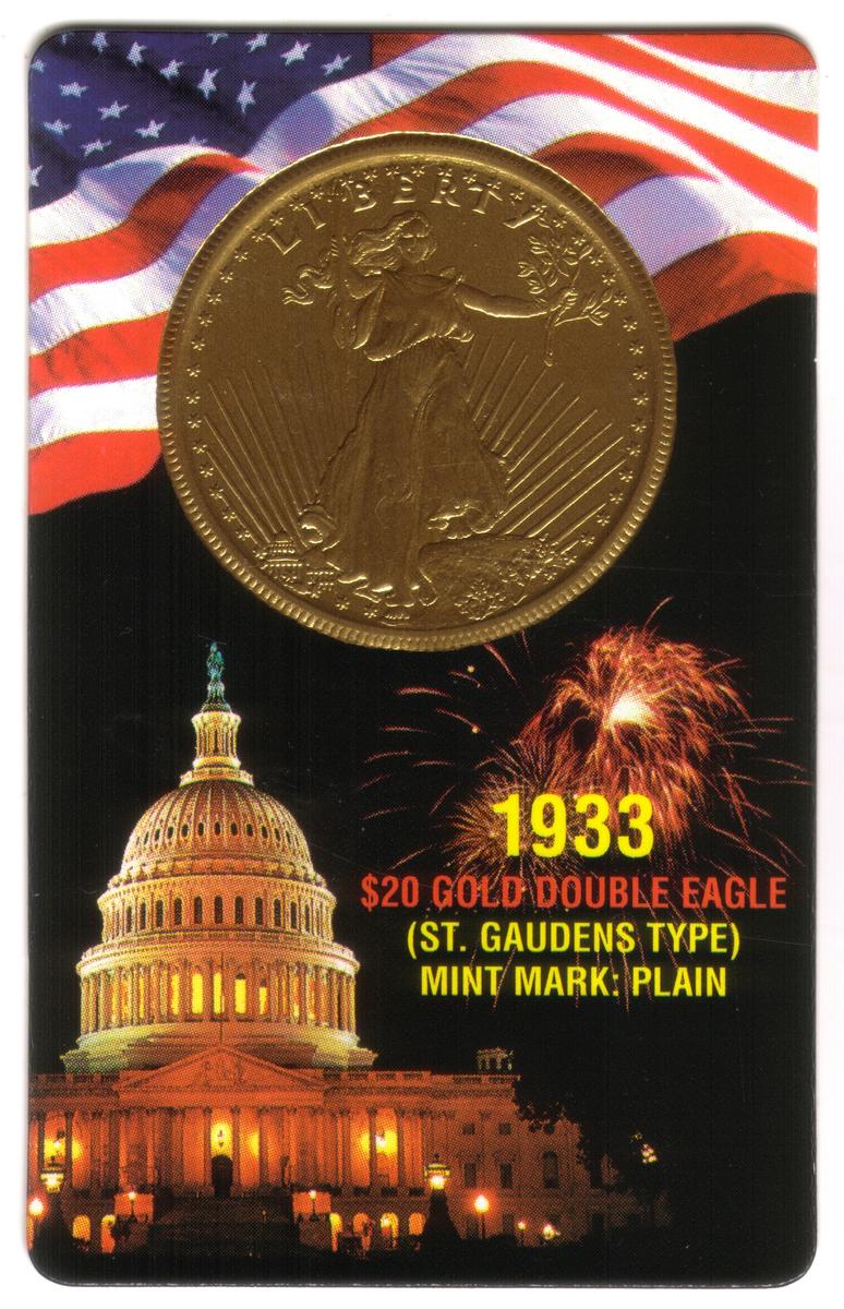The fourth card showcases a 1933 $20 Gold Double Eagle (St. Gaudens type) with a plain mint mark. The coin’s obverse depicts Lady Liberty holding a torch and an olive branch with rays of the sun behind her. The scene is set over the illuminated United States Capitol dome at night with fireworks in the sky and a large American flag above.