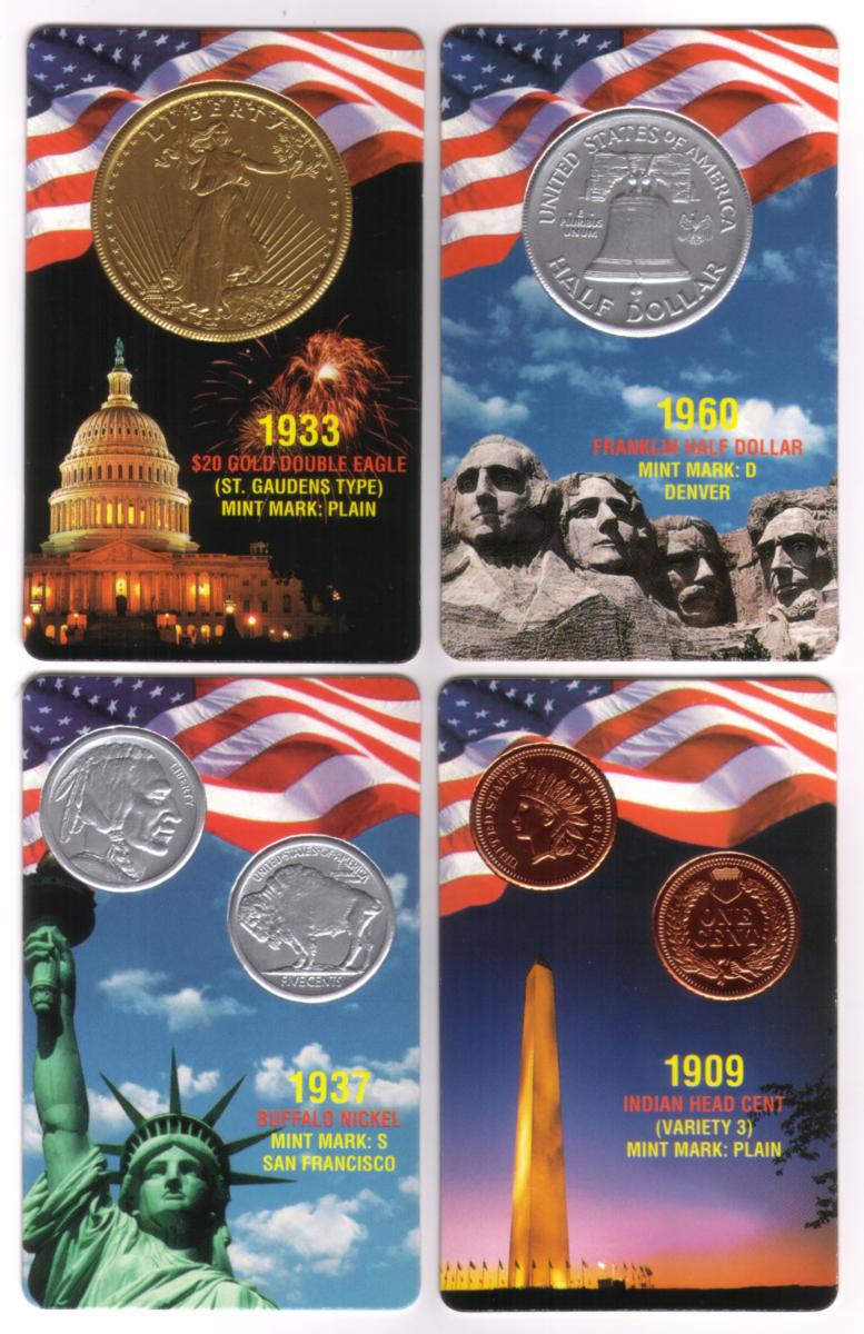Each card combines notable American coins with iconic landmarks and patriotic imagery, celebrating Americana, coins, currency, travel, and historic monuments.