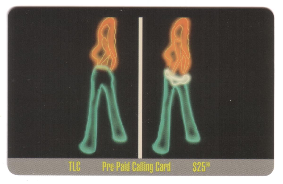 This collectible phone card features artwork related to the musical group The Cult. The central image shows a stylized, neon-like depiction of a woman with a star-shaped headpiece. She wears bell-bottom pants and stands against a dark background that emphasizes the bright, colorful neon effect in shades of pink, blue, and purple. The woman’s pose exudes a dynamic, retro vibe, reflecting the fashion and style associated with bell bottoms.