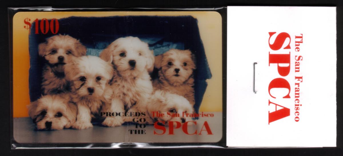 The card’s face has a bold red $100 denomination in the top left corner. Text on the right side states “Proceeds go to the San Francisco SPCA,” with “SPCA” prominently displayed in large red letters. This design clearly links the card to the many dogs helped by this non-profit organization.