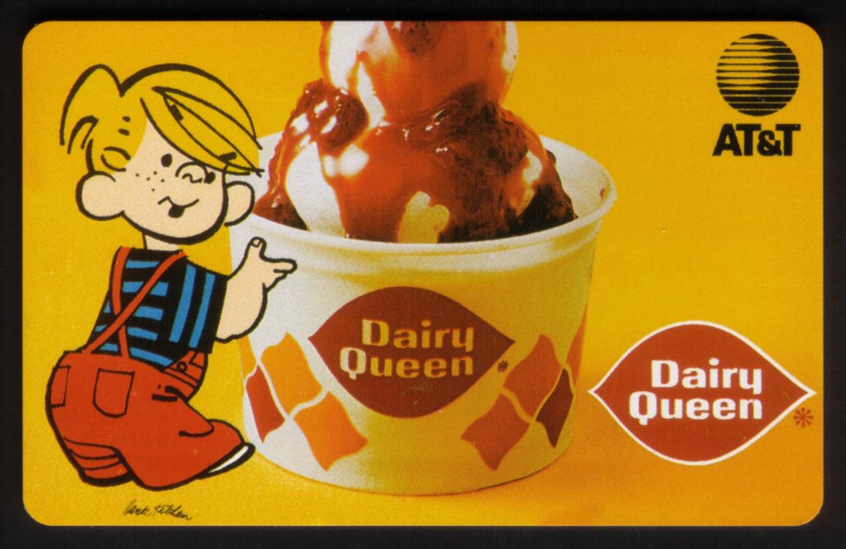 The illustration style is colorful and playful, capturing the essence of a classic ice cream treat endorsed by a well-known comic character, Dennis The Menace, alongside the Dairy Queen brand identity. This phone card is collectible and promotional, linking popular culture and food retail in a tangible format.