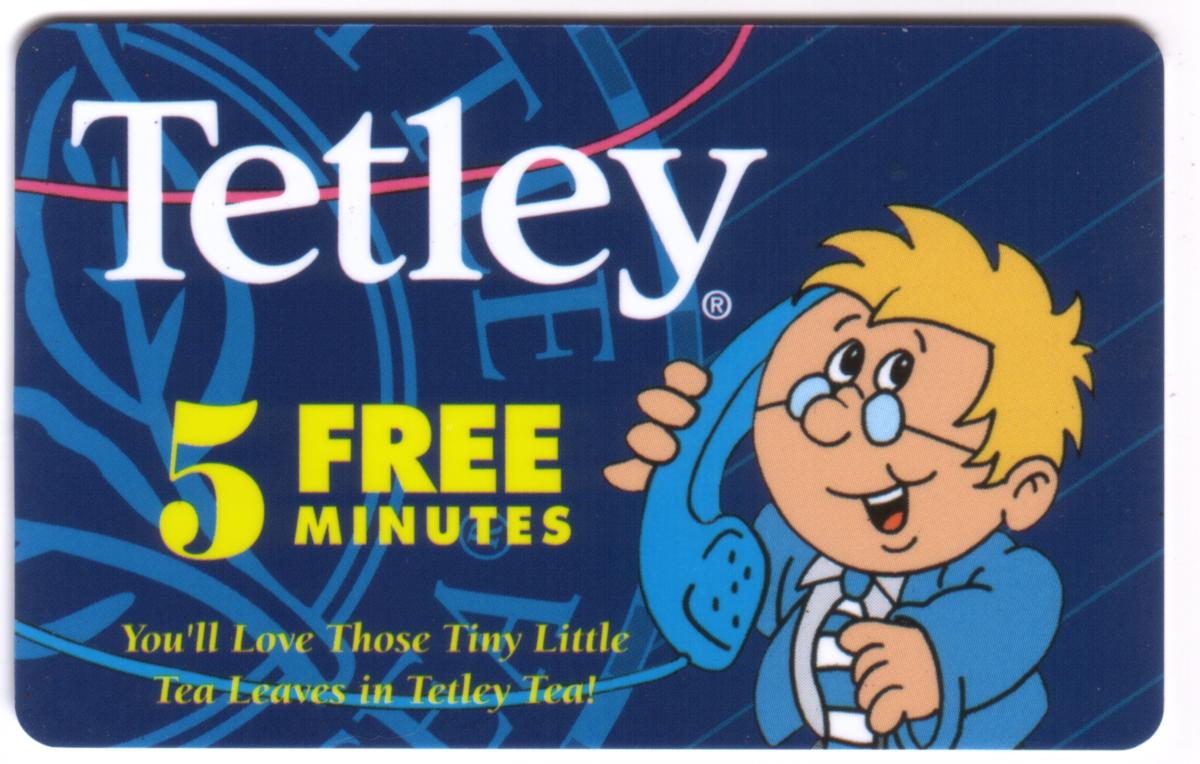 This collectible phone card features a colorful cartoon artwork prominently displaying the Tetley Tea brand. The design includes a playful depiction of a small teapot and a cup of tea, highlighting Tetley Tea’s theme with subtle visual elements intended to evoke the charm of tea leaves. The text “you'll love those tiny little tea leaves in tetley tea” is visibly incorporated, reinforcing the brand’s message.
