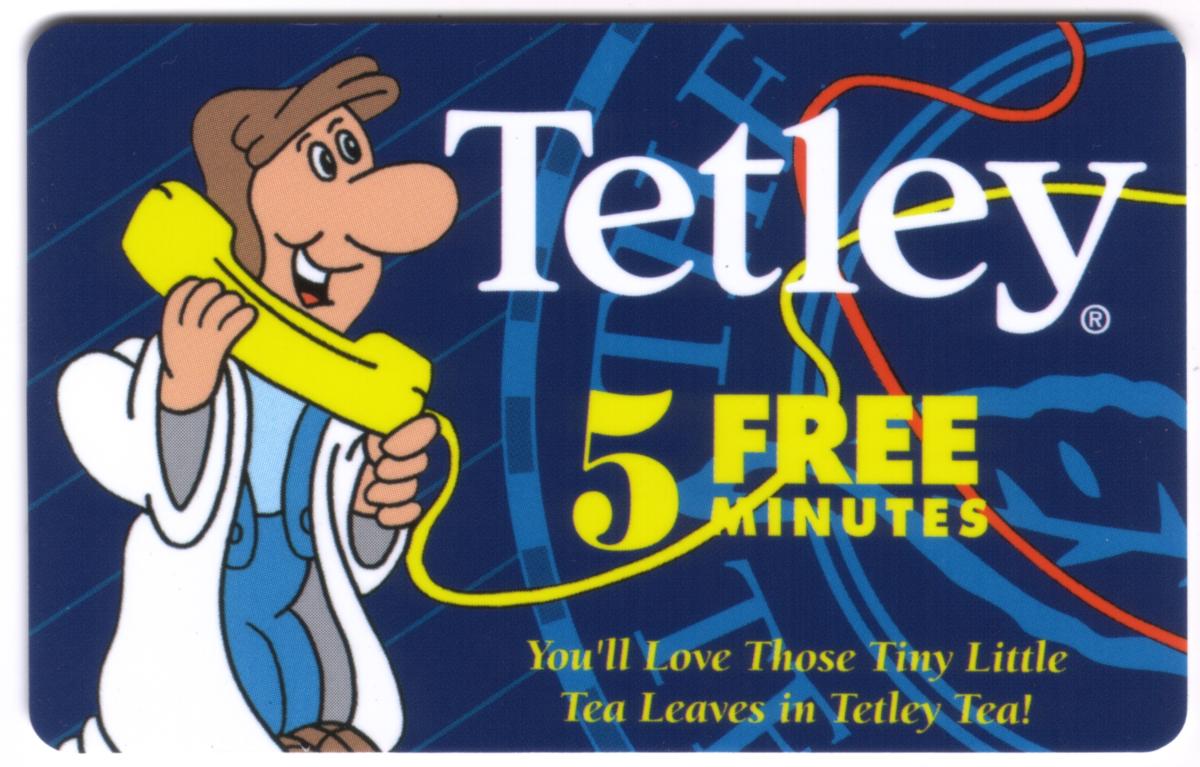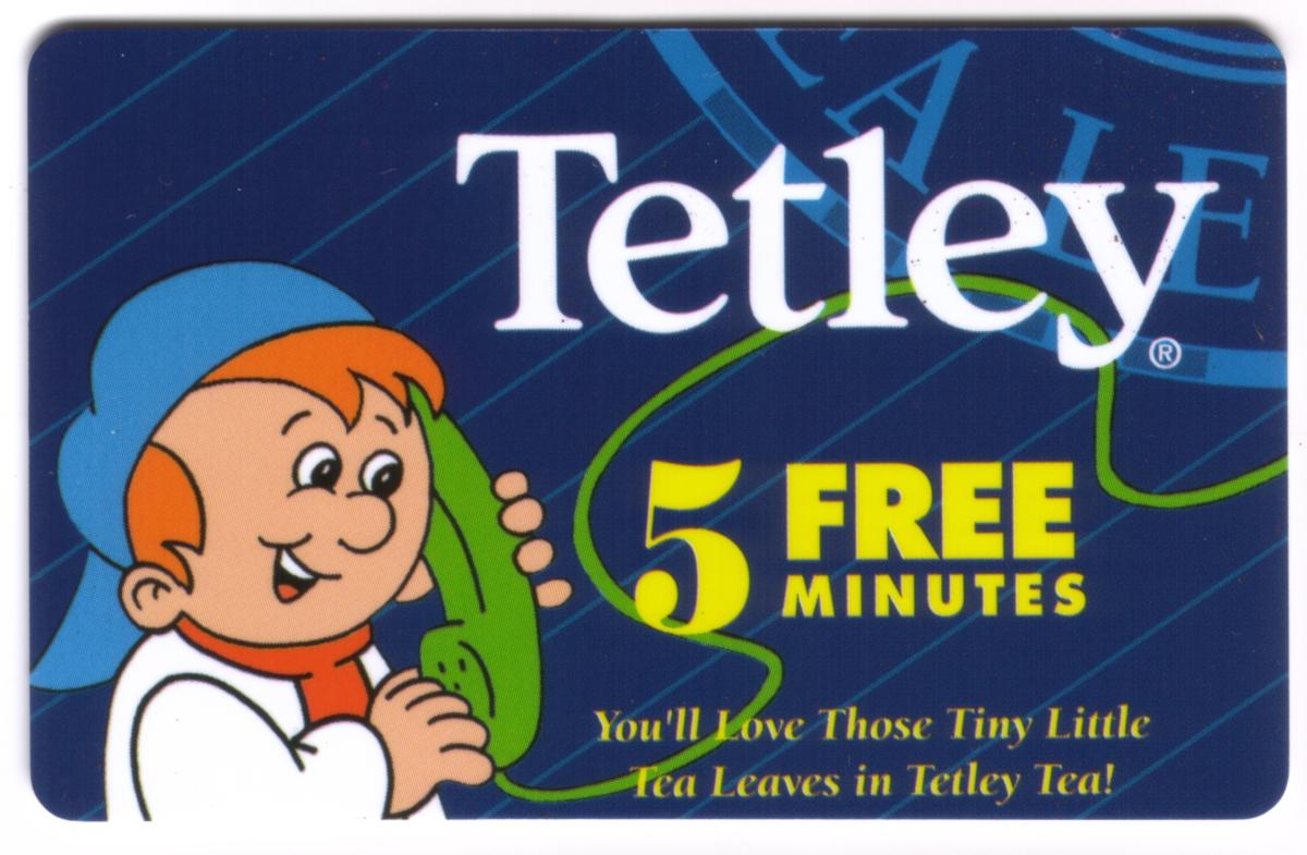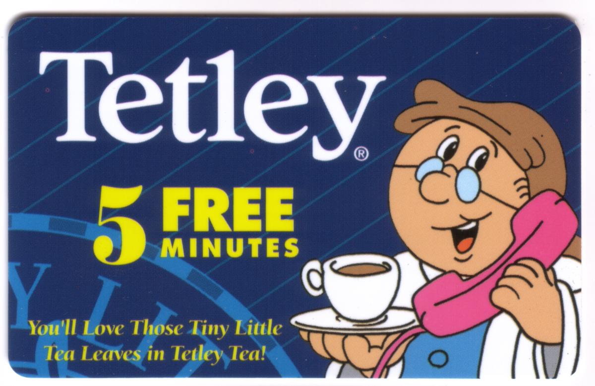 These collectible promotional phone cards feature six distinct cartoon characters associated with Tetley Tea. Each card prominently displays the Tetley logo in white against a dark blue background with a subtle design incorporating circular patterns and telephone line illustrations in various bright colors. The phrase "5 FREE MINUTES" is printed in bold yellow text on the right side of each card, emphasizing the call time available. Underneath, the tagline "You'll Love Those Tiny Little Tea Leaves in Tetley Tea!" appears in yellow cursive script.