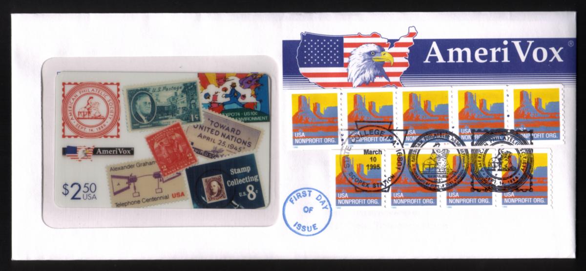 This collectible AmeriVox card features a collage of historic postage stamps and philatelic elements arranged artistically on its front. Central to the design is a blue United States 1-cent stamp bearing the portrait of Franklin D. Roosevelt, framing the left side of the card. Adjacent to it is a prominent red $2.50 stamp that appears to commemorate an event or figure tied to American history. Additional stamps include a round red emblem from the American Philatelic Society dated September 14, 1886, a stamp highlighting the Telephone Centennial with a drawing of an early telephone and "Alexander Graham" printed above, and an 8-cent stamp dedicated to "Stamp Collecting."