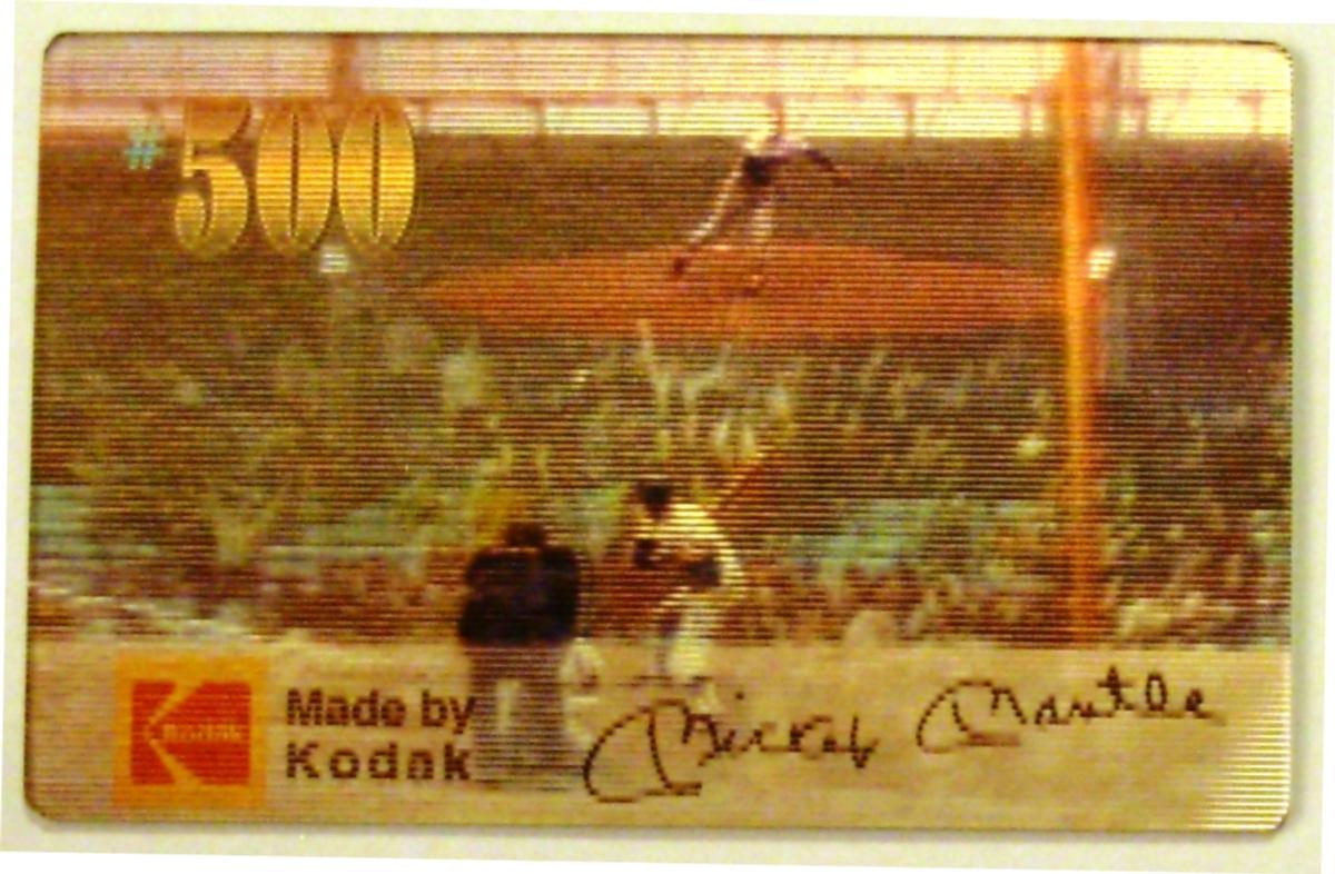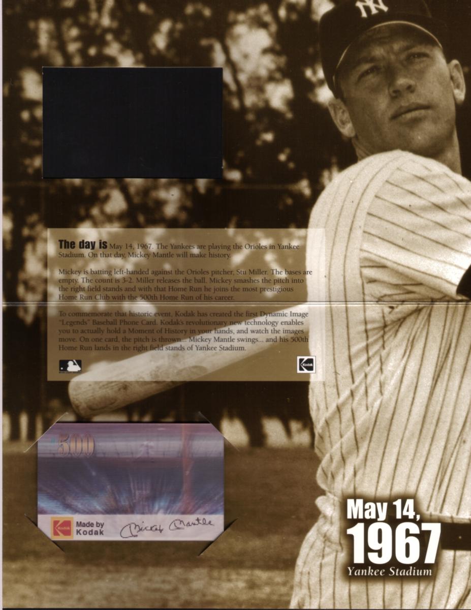 The card bears the title "Dynamic Image Legends" and specifically references the "Historical 5M Mickey Mantle MLB Baseball 500th Home Run" through a Kodak lenticular motion effect, emphasizing its collectible nature. It includes clear visual elements connected to Mickey Mantle properties and Major League Baseball iconography, aligning it with baseball memorabilia collectors and fans of baseball history.