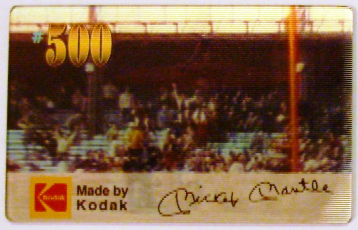 This collectible card commemorates the 30th anniversary of Mickey Mantle’s 500th home run in Major League Baseball. The card features a dynamic lenticular image that captures a legendary moment in baseball history, showcasing Mickey Mantle, a famed MLB player associated with the New York Yankees. The event took place at Yankee Stadium on May 14, 1967, a date prominently displayed on the card. The artwork highlights the significance of Mantle's achievement in Americana and American sports history.