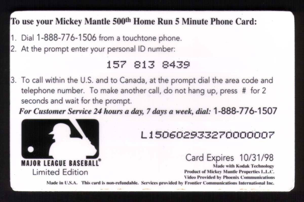 Produced by Frontier Communications, this item celebrates an iconic milestone in Mickey Mantle’s career and Major League Baseball lore. The card’s design integrates action imagery and historical context, making it a valuable piece for enthusiasts of baseball, American sports culture, and legendary baseball players.