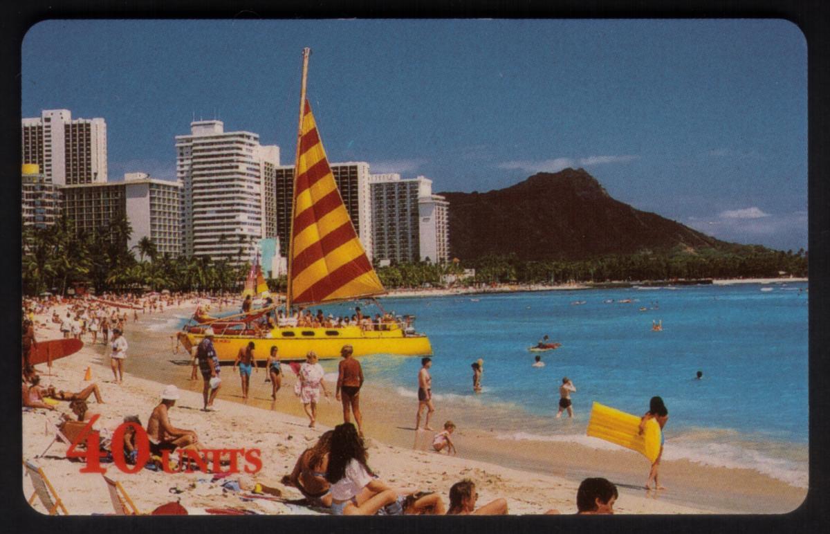 This card blends themes of travel, sun worship, nautical activities, and tourism, reflecting the atmosphere of a busy Hawaiian beach in the early 1990s. It captures both leisure and adventure with scenes of swimming, surfing, and sailing, making it a notable collectible for those interested in scenic and travel-related phone cards.