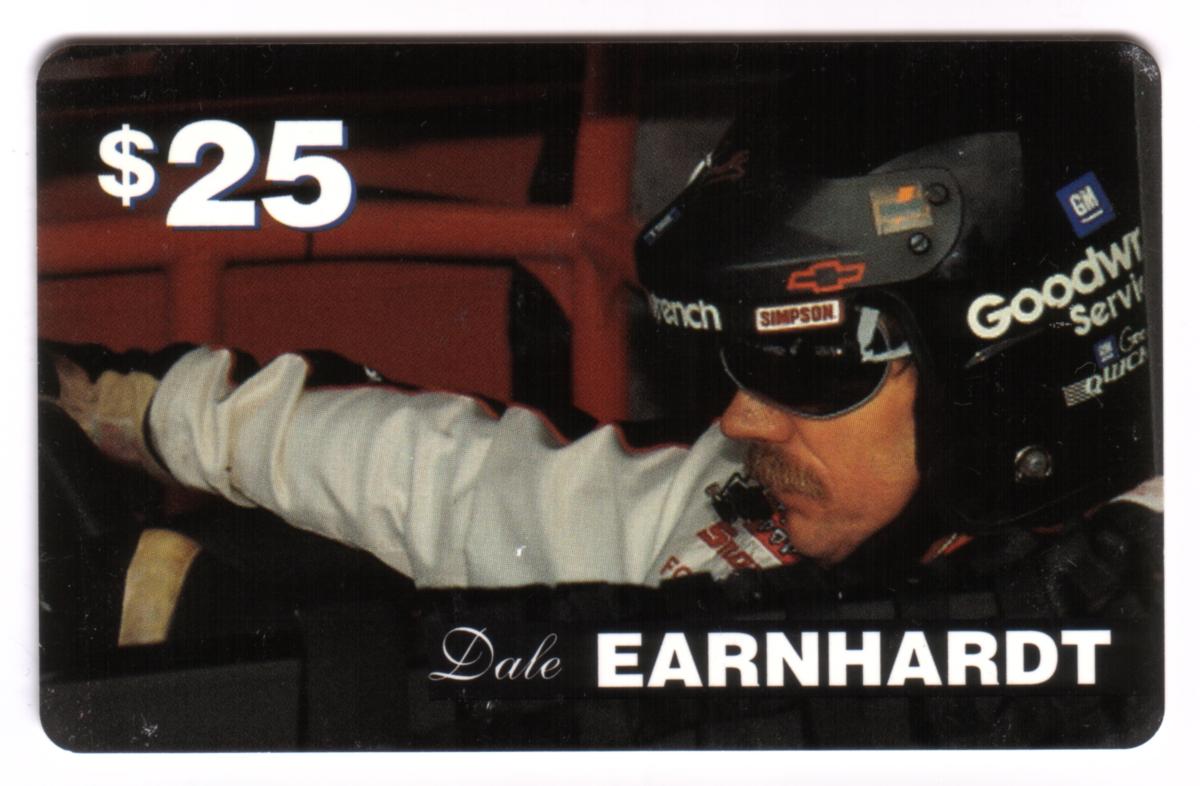 The card has a $25 denomination clearly printed in white in the top left corner. Dale Earnhardt's name is displayed at the bottom, with "Dale" in a cursive font and "EARNHARDT" in bold capital letters. The style and imagery emphasize Earnhardt’s connection to GM and Goodwrench, highlighting his presence in the world of professional auto racing.