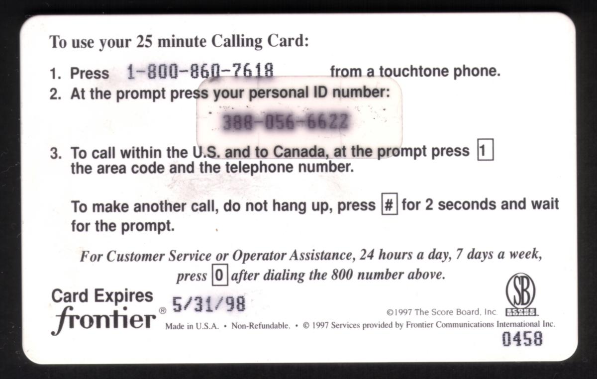 This card is part of The Score Board collectible series and is linked to the Frontier telecommunications brand. The card was expired as of May 31, 1998, and was used. It reflects the period’s motorsport culture and Earnhardt’s iconic reputation in NASCAR history.